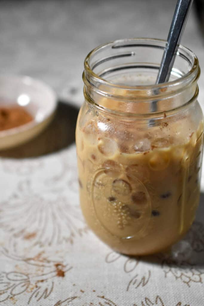 Pumpkin Iced Latte in a mason jar with a bowl of spices in teh background